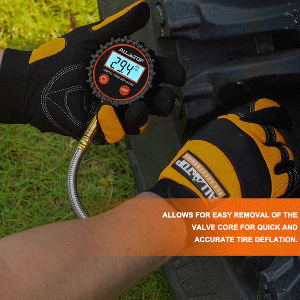 تنظیمکننده سریع باد دیجیتال ALL-TOP مدل ATTD002 یک ابزار حرفهای برای رانندگان آفرود، SUV، تراک و موتورسیکلت است. این دستگاه با نمایشگر دیجیتال بکلایت امکان خواندن فشار تایر در واحدهای مختلف (PSI، Bar، Kpa و Kg/cm²) را حتی در تاریکی فراهم میکند.