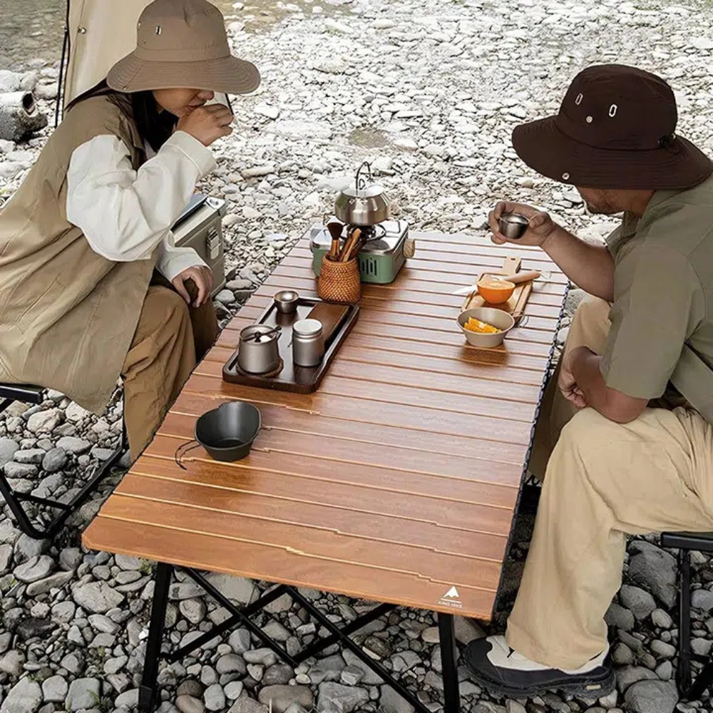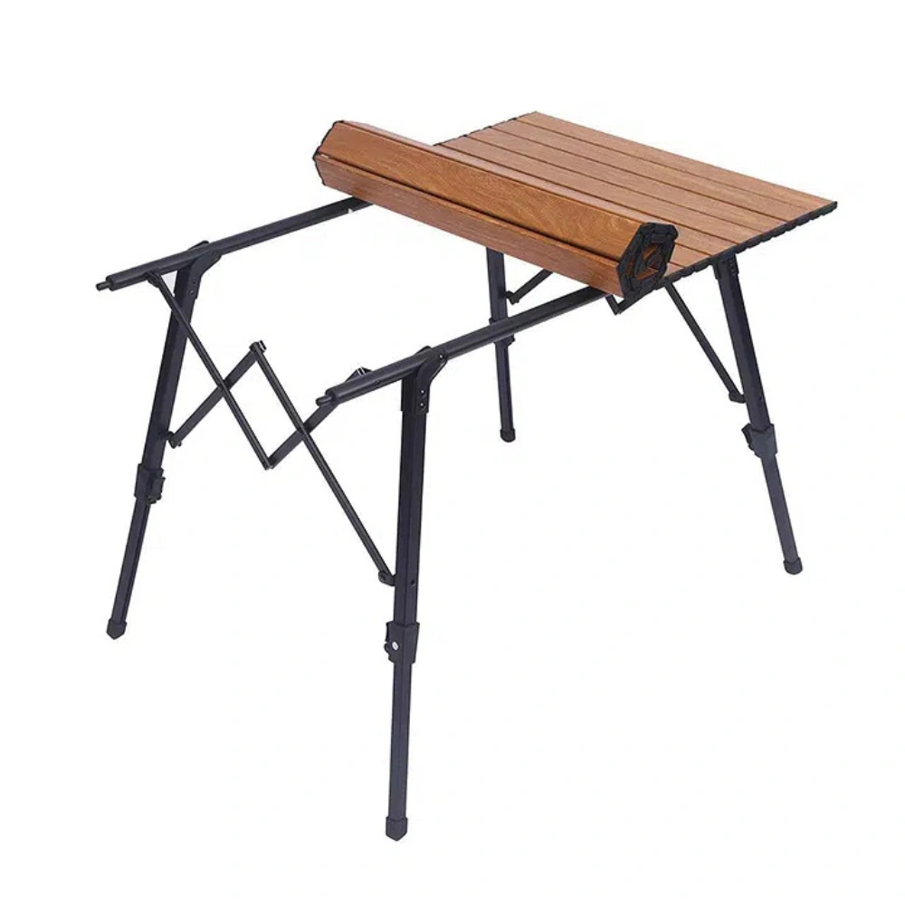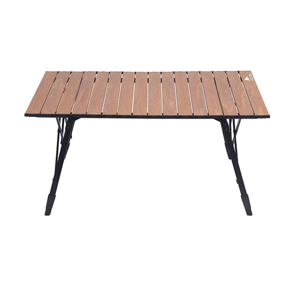 میز آلومینیومی King Hike مدل HK011 با ساختار تاشو و آکاردئونی، رویه آلومینیومی سبک با طرح چوب، پایههای مستحکم، قابلیت تنظیم ارتفاع 43 تا 64 سانتیمتر، تحمل وزن تا 30 کیلوگرم و کیف حمل مقاوم Oxford 600D