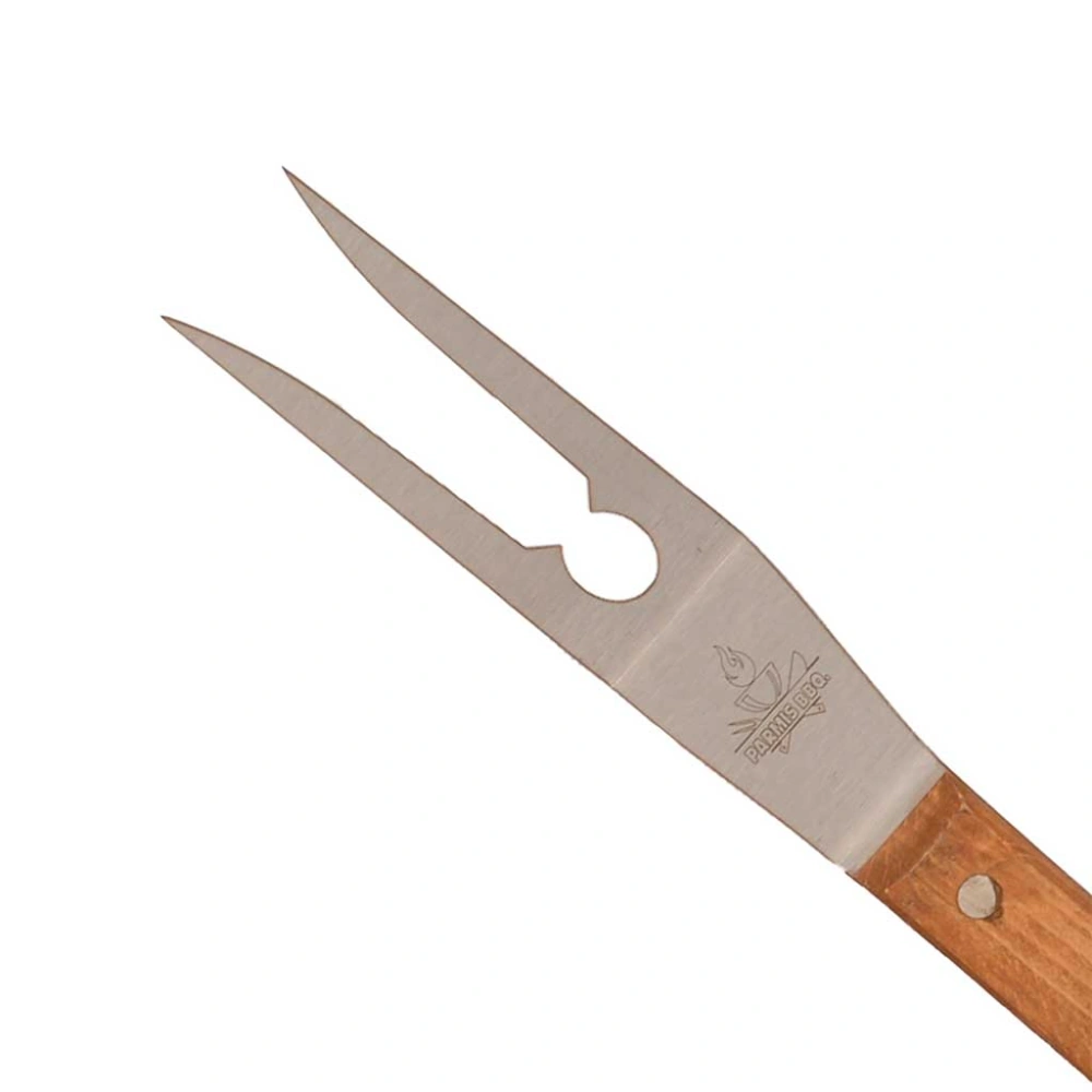 چنگال دوشاخه استیل پارمیس کد 107254 با دسته چوبی آرگونومیک، مقاوم در برابر حرارت و دارای روکش ضد زنگ، ابزار ایدهآل برای گریل کردن مرغ، گوشت و سایر مواد غذایی در فضای باز و آشپزخانه است. دسته بلند چوبی آن از سوختن دستها جلوگیری کرده و استفاده طولانی مدت را راحت میکند.